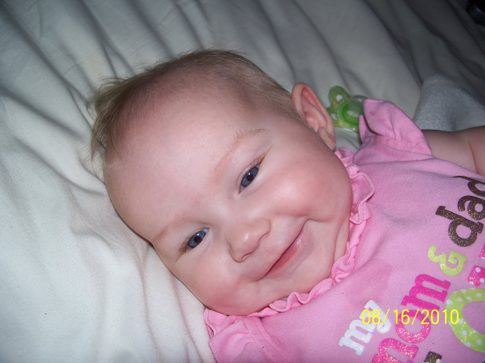Waverly is such a little ham! She had just awoken from a nap here and was all smiles and silliness. Her favorite game is patty-cake now. She loves for you to help her clap her hands and toss it in the pan!
